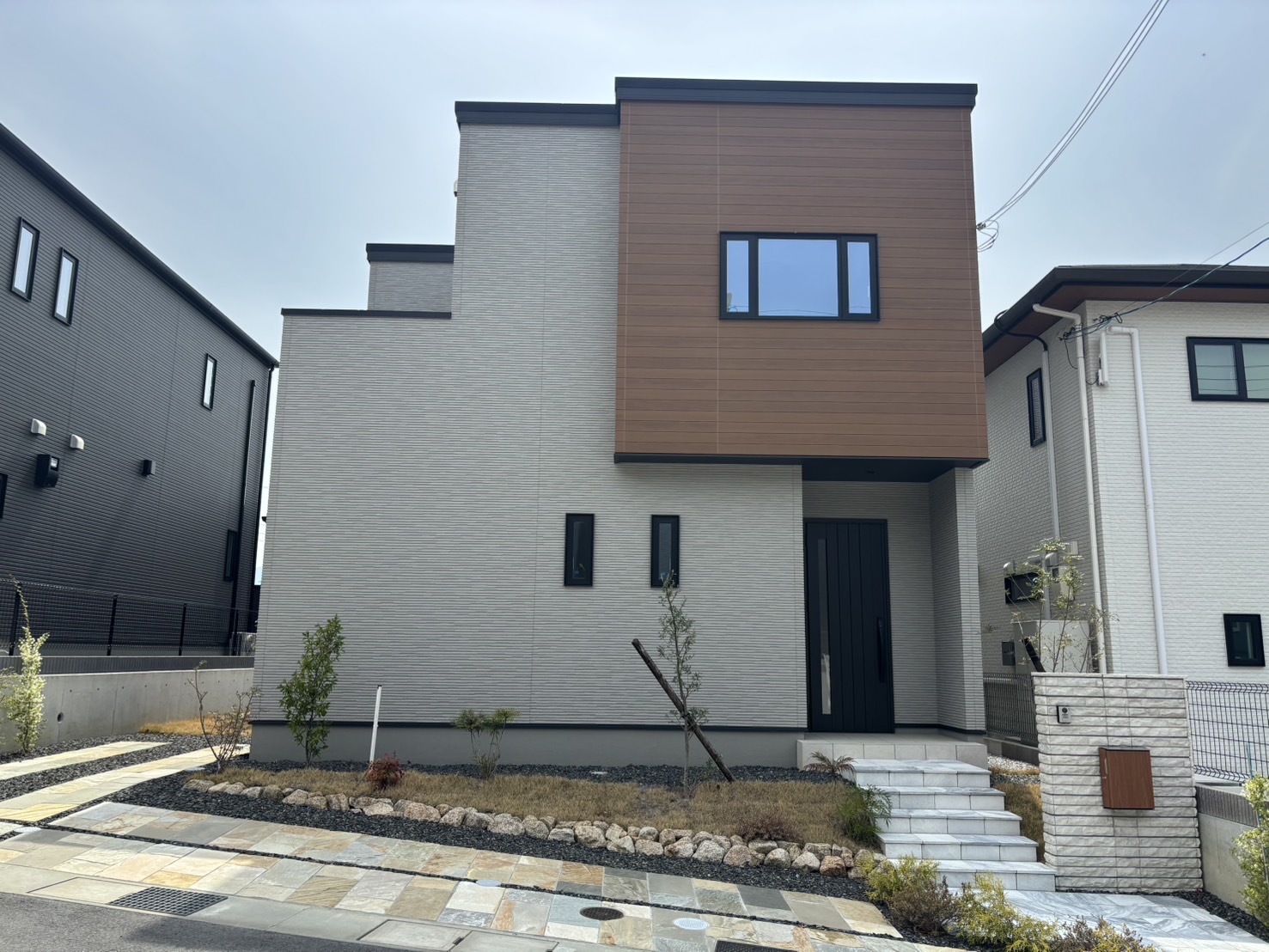 黒を基調としたシンプルでモダンな外観が特徴です。直線的なデザインとコンクリートの塀が都会的で洗練された印象を与える住まいです。