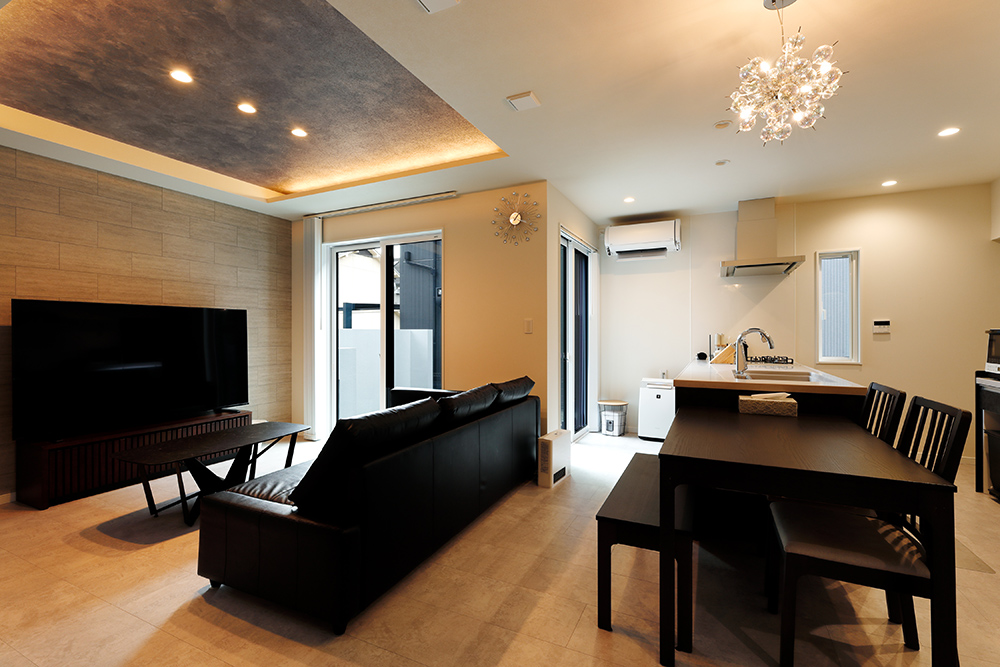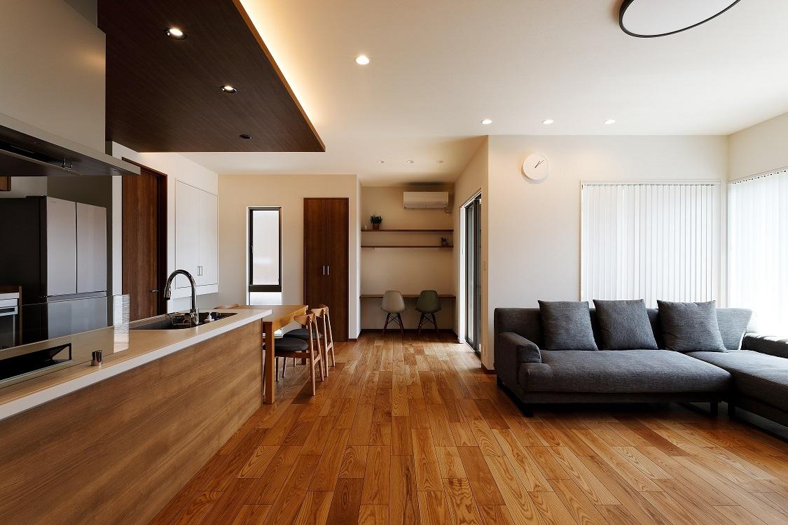 着座でくつろぐローリビングや アウトドアリビング、 モダンデザインの本格和室など、 落ち着く空間デザインを希望されたYさま。 キッチンは曲線を描く折り下げ天井で、 洒落た雰囲気に。 プランにもデザインにもこだわった、 癒しの空間ができました