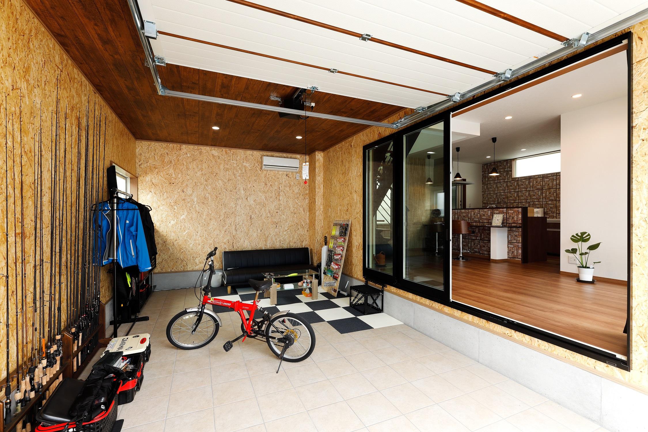 1階に趣味の釣り部屋をつくり、そこからつながるホームバーのようなLDKを実現。 凹凸感のある壁材や、ハイドア、デザイン階段、ブラックスチールのペンダントライトが、男前な雰囲気と共に高級感を醸し出しています。ビルトインガレージにもなる釣り部屋には大開口を設けて、断熱材が入った電動シャッターを設置。 随所に「遊び心」が感じられる住まいが実現しました。