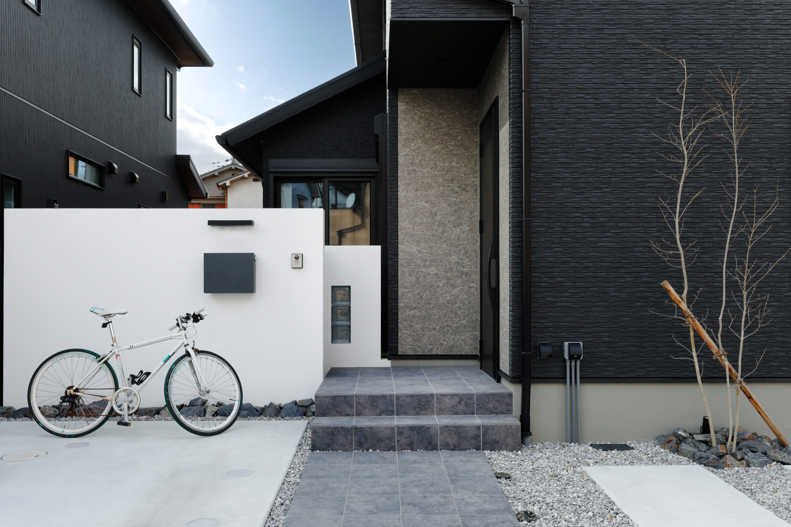 事務所兼自宅への建て替えは、 コストが抑えられるよう、コンパクトに。 インナーガレージは車とバイクどちらも 駐車できるように設計、 大容量の収納スペースも設けました。 外壁にはKMEW(ケイミュー)の 次世代外装パネル「レジェール」を採用。 メンテナンスフリーで 10年先もキレイが続く機能性に加え、 21ミリ厚の深い彫りがつくる高級感が印象的です。 事務所スペースは将来的に賃貸できるよう、 動線を分離。玄関もふたつ設けました。