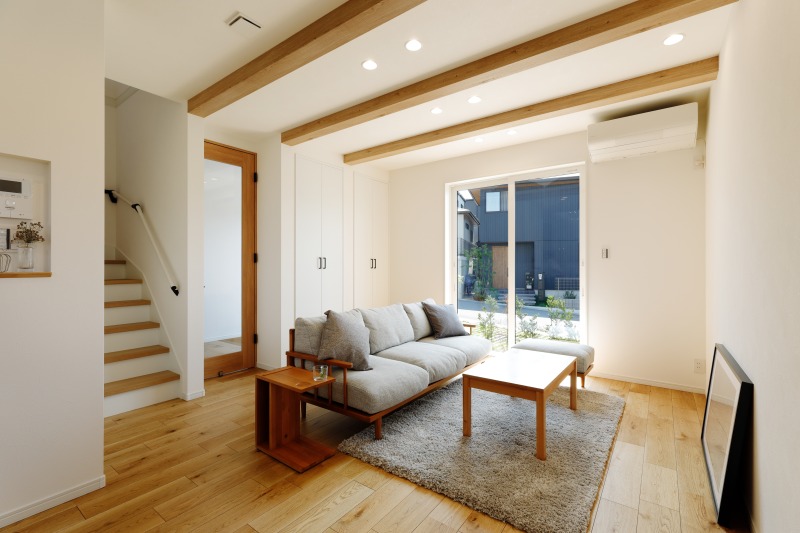 内装はできるだけシンプルに仕上げ、お好みの家具が映えるようにデザイン。造り込みすぎない「余白」のあるインテリアでは季節感が演出しやすく、お子さんたちが描いた絵を 飾るのもいいですね。床は、どんな家具とも相性のいい、オーク系の木質フローリング。日々仕事に、家事に、育児に忙しい子育て世代を、やさしく包み込むナチュラルデザインに仕立てました。